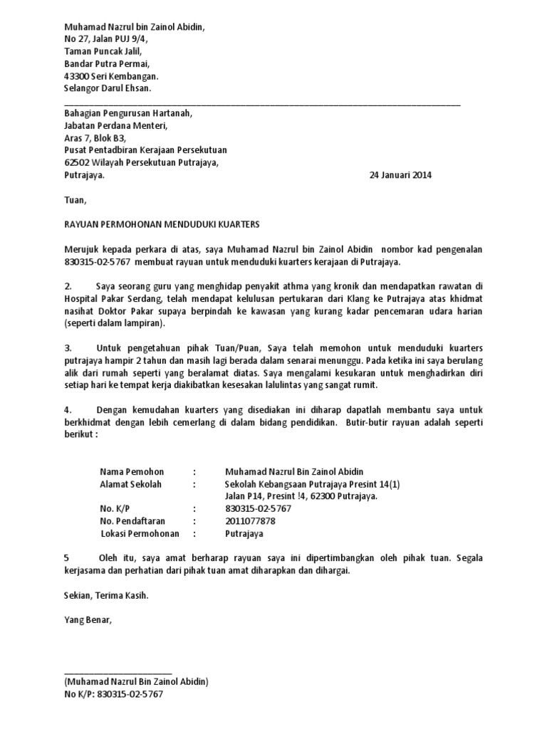 Rumah Contoh Surat Rayuan Permohonan Kuarters Kerajaan